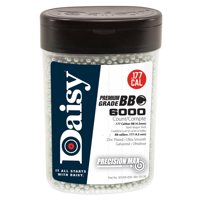 Experience the reliability and performance of Daisy PrecisionMax .177 Caliber BBs. Crafted from zinc-plated steel, these round BBs are designed for precision and consistency in every shot. With an ample supply of 6000 BBs per bottle, you'll have plenty to keep you going for all your target practice and recreational shooting needs. Ideal for those who demand accuracy and dependability, these BBs are perfect for enhancing your shooting experience.