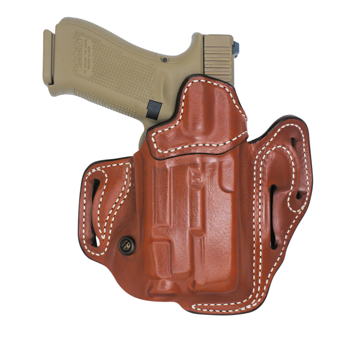 The Vengeance Scabbard 201 holster is crafted from premium US full-grain steerhide, offering a blend of durability and style. Specifically designed for the Glock 19, this open-top pancake-style OWB holster features three belt slots, providing versatile carry options. Its adjustable tension device ensures a secure fit, while the wraparound band enhances strength and ease of reholstering. Ideal for right-handed users, this tan leather holster also accommodates the Streamlight TLR-7A, making it a reliable choice for those seeking both function and form.