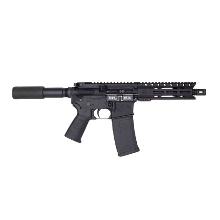 It has 7075-T6 aluminum receivers, a 6" M-Lok handguard, Magpul MOE grip, and a buffer tube foam pad.