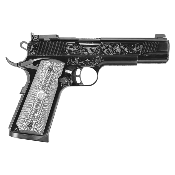 Girsan mc1911 match lux finish with a hand engraved slide and frame, the markings were moved to the perimeter of the pistol profile for a cleaner look, a hard black chrome slide and frame to give you a deep dark consistent color.Other features are a g10 grip, ambidextrous safety, 2.5 to 3 lbs trigger, extended beavertail, competition rear sight, steel machine frame and slide, and long hole hammer.It has a 8+1 capacity and a 5" barrel.Includes lockable, leather case.