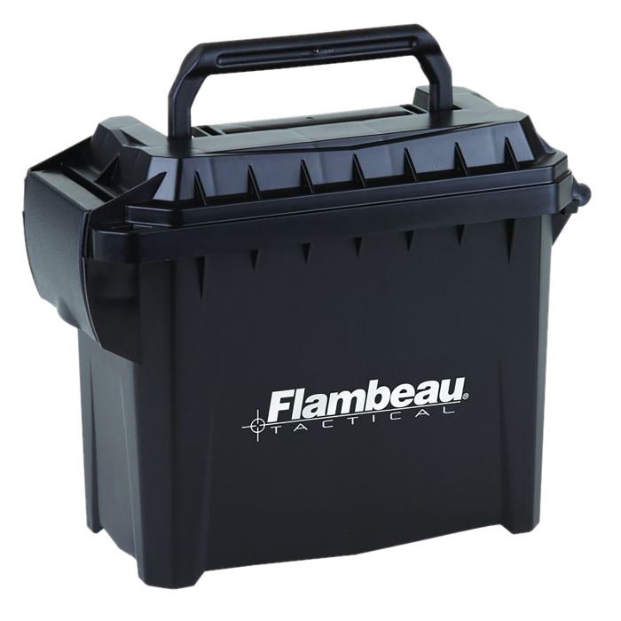 The Flambeau Mini Ammo Can is a robust storage solution crafted from durable black polymer, designed specifically for securely holding ammunition. This compact can is weatherproof, ensuring your .45 ACP or 9mm rounds are protected from the elements. Capable of accommodating up to four standard 50-round boxes of .45 ACP or five boxes of 9mm, this mini model offers efficient space utilization while maintaining easy portability. Ideal for both range days and home storage, it combines practicality with rugged reliability, setting it apart from typical ammo cans.