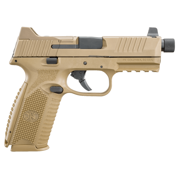 Fn's 509 pistol is built on the proven architecture of the fns compact.It features a cold hammer-forged stainless-steel barrel with a recessed target crown and polished chamber and feed ramp.The polymer frame has an enhanced grip texture for faster follow-up shots in all conditions, a mil-std-1913 accessory rail, and interchangeable backstraps.This striker-fired double action pistol has an external extractor, loaded chamber indicator, and no manual safety.It is equipped with a fully ambidextrous slide stop lever and magazine release.This fn 509 tactical model has a flat dark earth slide with an fde polymer grip/frame, two fde interchangeable backstraps, and suppressor height night sights.This model comes with two (2) 10-round magazines and a fn logo soft pistol case.