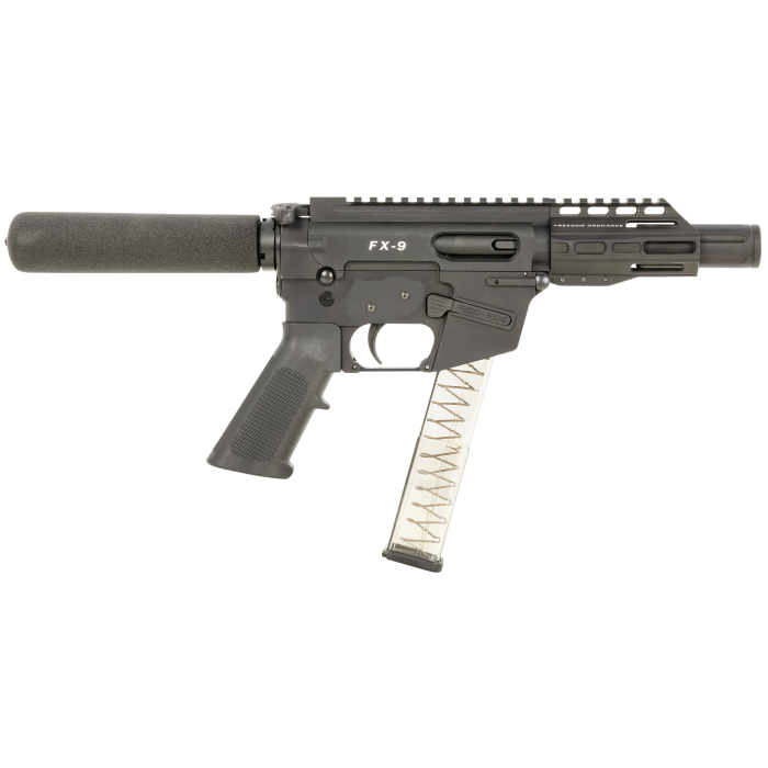 Made in the USA, the FX-9 represents freedom to the extreme. The FX-9 sling models feature a QD receiver end plate designed with quarter-turn rotational over-travel stops and a heavy-duty 1.5 adjustable polyester sling with an adjustable inner length of 42-58 inches. The sling models also include a faux suppressor and a foam buffer tube cover. As this model is braceless, it does not fall under NFA guidelines. The FX-9 features a semi-auto action, a 9mm caliber, a 4-inch barrel length, a 32+1 capacity, a manual thumb safety, black A2 grips, and is optic ready with an overall length of 19 inches.