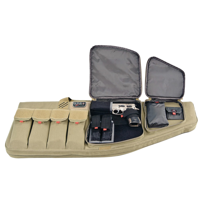The G*Outdoors Tactical AR Visual ID Rifle Case in tan is the ultimate storage solution for your rifle and accessories. Designed with the innovative Visual ID Storage System, it ensures quick and easy identification of your gear. The front storage pocket features a customizable modular handgun retention system and removable magazine storage pouches, allowing you to configure the layout to your specific needs. The right front pocket includes velour-lined compartments for protecting shooting glasses and earplugs, with additional space for other essentials. Built from durable 1000D polyester with lockable YKK zippers and padded for added protection, this case is both secure and reliable. Metal D-rings on both ends make it convenient to hang when not in use, making it a practical choice for any firearm enthusiast.