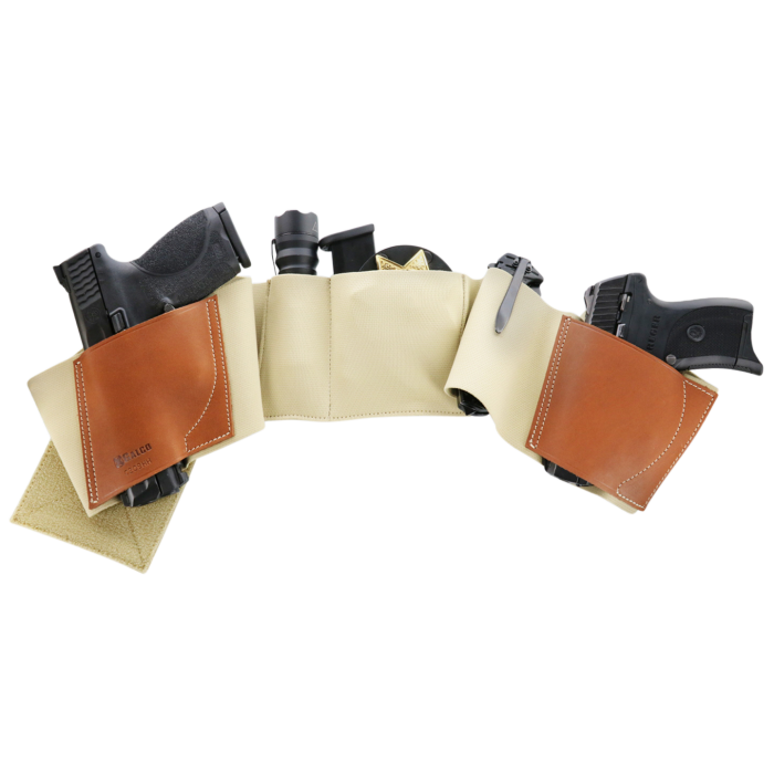 The Galco UnderWraps Belly Band in Medium Khaki offers unmatched versatility for concealed carry enthusiasts. Combining durable leather and nylon construction, this belly band is designed for all-day comfort and reliability. Featuring two secure leather holster pockets, it allows you to carry one or two firearms simultaneously, while two additional accessory pockets provide space for essentials like badges, cuffs, or extra ammunition. Its adaptable design accommodates right or left-hand draw and supports multiple carry positions, including strongside, crossdraw, and appendix carry. The UnderWraps can be worn low on the waistline or higher around the torso for optimal concealment and accessibility. Perfect for those seeking a discreet and customizable carry solution.