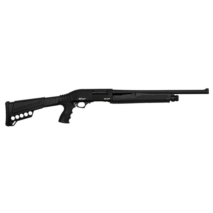 Pump action 12ga shotgun.2" & 3" compatible.5+1 internal capacity without tube extension.7+1 internal capacity with tube extension.16 rounds combined internal & external capacity.7lbs unloaded.20" barrel length.40.5 overall length.Fixed cylinder bore.Fixed blade front sight.The gf2p loaded is ready to be equipped with a flashlight, a sling, and can carry 16 rounds of 12ga ammunition.