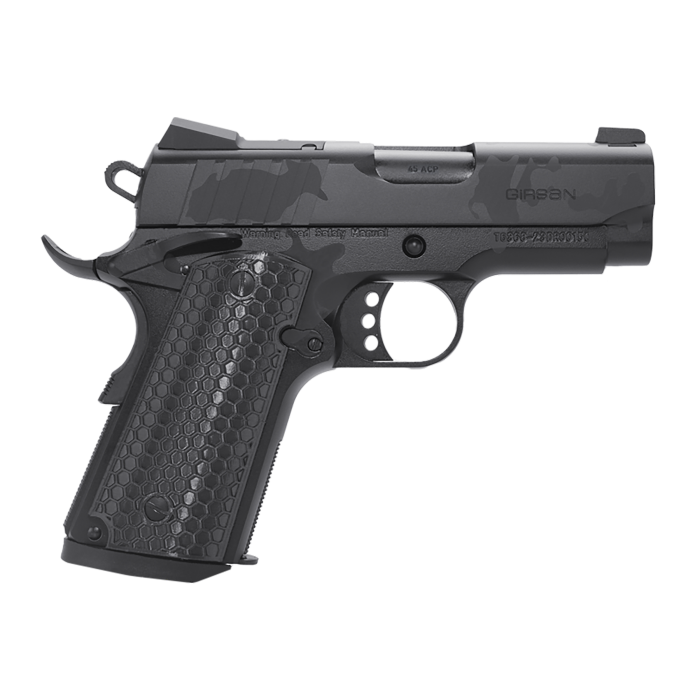 The Girsan MC1911 SC in 9mm Luger combines precision and style in a compact design perfect for enthusiasts and professionals alike. Its 3.40-inch barrel ensures accuracy while maintaining portability. The sleek black camo finish not only enhances its appearance but also provides durability. Featuring an optic-ready slide with serrations, this pistol is prepared for advanced sighting options. The ambidextrous safety and adjustable sight offer versatility and customization for any shooter. Equipped with a long hole hammer and enhanced trigger system, the MC1911 SC delivers a smooth shooting experience. The black polymer grips and accessory rail further enhance functionality, making this firearm a standout choice for those seeking reliability and performance.