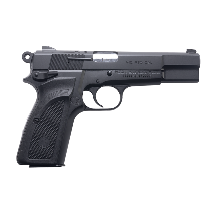 Experience the precision and reliability of the Girsan MCP 35, a 9mm semi-automatic handgun that seamlessly blends classic design with modern enhancements. This firearm features a robust black steel frame and slide, equipped with serrated grips for a secure hold. The 4.87-inch barrel and windage drift adjustable rear sight ensure accurate targeting, while the dovetail front sight offers quick acquisition. Its traditional slim trigger provides a short reset, ideal for rapid firing even with gloves. The MCP 35 stands out with its ambidextrous safety and external extractor, enhancing functionality and safety. With a 10+1 capacity, this handgun is designed for those who appreciate both heritage and performance.