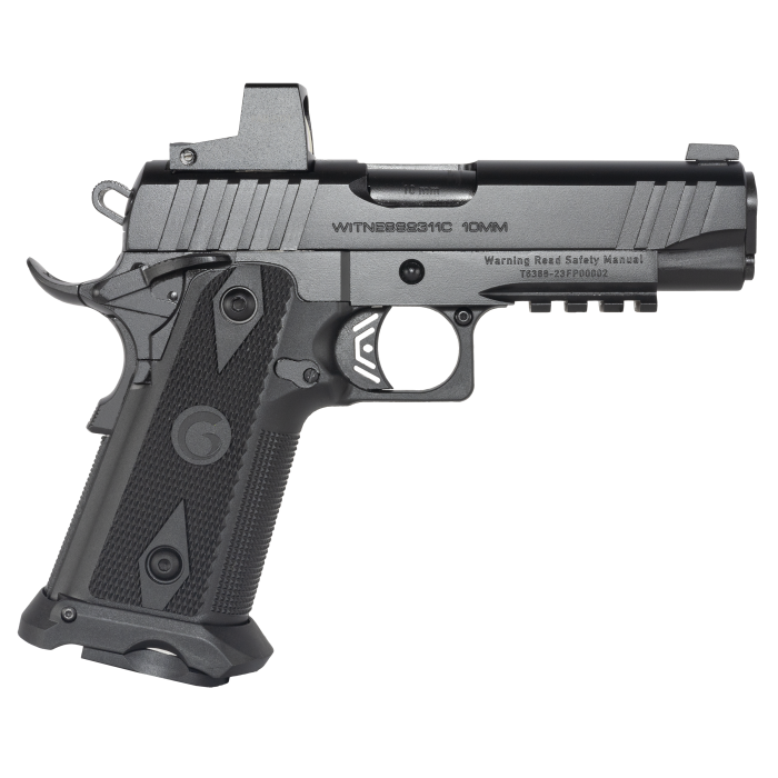 The Girsan Witness2311 10mm Auto stands out as a robust and versatile option for firearm enthusiasts seeking a reliable sidearm. This double-stacked 1911 semi-automatic pistol features a durable black steel frame complemented by ergonomic black checkered polymer grips, ensuring a secure hold. The 5-inch barrel and optic-ready serrated slide enhance its precision, while the extended beavertail and accessory rail provide added functionality. With a fiber optic front sight and adjustable rear super sight, target acquisition is swift and accurate. The ambidextrous safety and skeletonized trigger contribute to its user-friendly design, making it an ideal choice for both right and left-handed shooters. Capable of holding 15+1 rounds, the Witness2311 combines style and performance seamlessly.