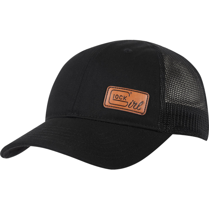 The Glock Women's Ponytail Hat offers a stylish and functional accessory for any casual outing. Crafted from black chino twill with a breathable mesh back, this hat ensures comfort throughout the day. It features a distinctive leather patch with the Glock Girl logo on the front, adding a unique touch to your look. Designed specifically for women, it accommodates ponytails effortlessly, making it both practical and fashionable.