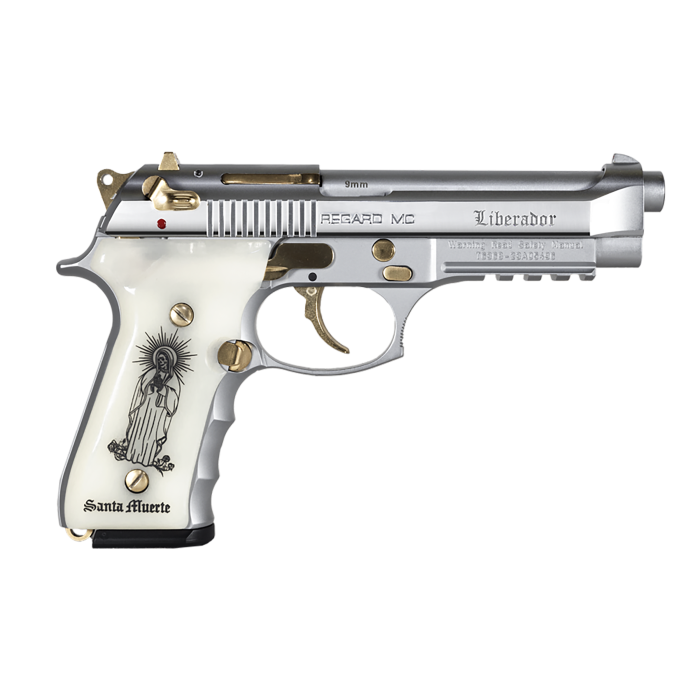 The GiRSAN Regard MC 9mm Liberador captures attention with its unique blend of elegance and cultural homage. This semi-automatic pistol is designed with a 4.90" barrel and an impressive 18+1 capacity, ensuring both precision and ample firepower. Its standout feature is the beautifully serrated slide, polished to a mirror-like finish, accented by gold trims and adorned with engraved pearl grips that celebrate the iconic Santa Muerte. The Regard MC maintains its trusted performance with a convenient decocker safety on the slide, all encased in a durable chrome frame with gold accents. This firearm combines functionality with a striking aesthetic, making it a prized addition for collectors and enthusiasts alike.