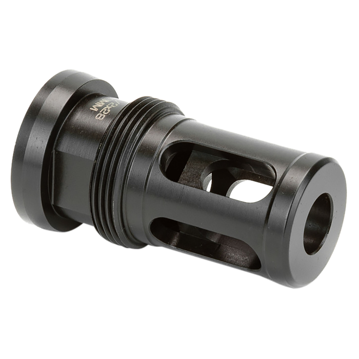 The Griffin Armament Taper Mount Hammer Comp is a high-performance muzzle device designed to enhance your firearm's stability and durability. Engineered with two sacrificial baffles, it effectively reduces recoil while extending the service life of your suppressor. Its slotted compensating features are precision-tuned for superior muzzle stability, ensuring enhanced accuracy and control. Crafted from heat-treated 17-4ph stainless steel and CNC machined from a solid bar, this comp is built for exceptional strength and longevity. Measuring 1.89 inches in length, it is specifically designed to pair seamlessly with "14.7" barrels to achieve a 16.1-inch non-NFA length when combined with an A2 flash suppressor and crush washer. Finished in sleek Black QPQ and boasting a 1/2"-28 thread pattern, this is the ideal choice for shooters seeking durability and performance in one compact package.