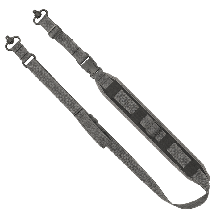 The Grovtec US QS Sentinel 2-Point Adjustable Sling in Wolf Gray combines functionality and comfort for a superior carrying experience. Featuring durable 1" wide webbing paired with a 2" wide padded shoulder support, this sling ensures long-lasting comfort during use. Its innovative quick slide functionality allows for seamless adjustments; simply pull forward to extend or pull back to tighten. Designed for a 2-point carry style, it includes an emergency release buckle for added safety and convenience. The sling is fully adjustable to fit your needs and comes equipped with heavy-duty push-button swivels for secure attachment. Sleek, reliable, and practical, this sling is an essential accessory for your gear.
