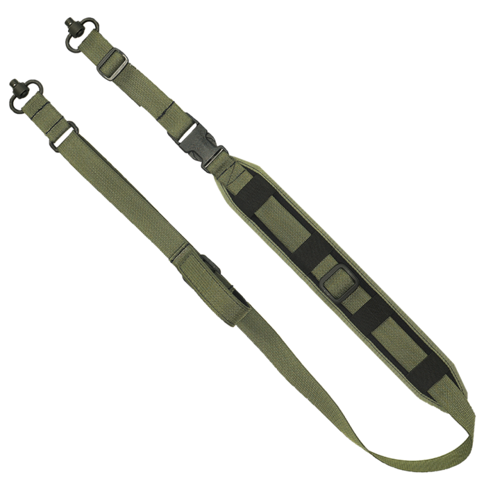 The GrovTec US Sentinel QS 2-Point Adjustable Sling is a reliable and versatile solution for your firearm carrying needs. Crafted with 1" wide webbing and a 2" wide padded shoulder support, it ensures all-day comfort during use. Its innovative quick slide functionality allows you to seamlessly adjust the sling by pulling forward or backward, offering effortless customization on the go. Designed for a 2-point carry style, it features an emergency release buckle for added convenience and safety. The sling includes heavy-duty push-button swivels and comes in a durable OD Green color, making it both functional and stylish for any outdoor or tactical setting.
