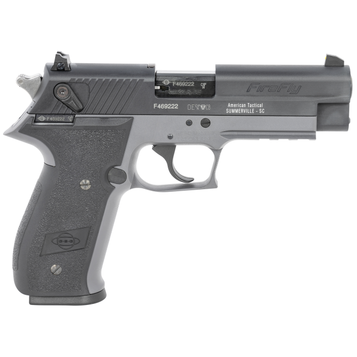 The slide features adjustable sights, and along with the rugged blowback system, fixed barrel and superior ergonomic grip, the GSG FireFly delivers exceptional accuracy. Additional safeties include an internal locking device and slide mounted ambidextrous safety.