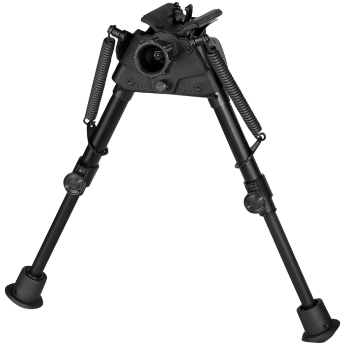 Enhance your shooting precision with the Harris 6-9" Swivel Stud Bipod, engineered for stability and ease of use. This bipod features self-leveling rubber feet, providing a reliable grip on various surfaces. With spring-loaded folding legs, quickly adjust the height from 6 to 9 inches to suit your needs. Constructed from heat-treated steel and durable aluminum, it offers a robust yet lightweight design at only 12.50 ounces. The sleek black anodized finish ensures durability and a professional appearance. Perfect for rifles with swivel sling studs, this bipod offers a secure attachment and a convenient sling provision, making it an essential accessory for any marksman.