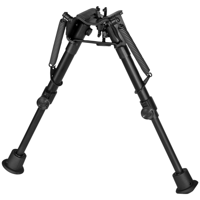 The Harris Bipods 6-9" Non-Swivel Self Leveling model offers unparalleled stability and precision for rifle enthusiasts. Designed to attach seamlessly to swivel sling stud rifles, these bipods feature spring-loaded, self-leveling folding legs, ensuring quick height adjustments between 6 and 9 inches. Crafted from heat-treated steel and durable aluminum alloys, the bipods boast a sleek black anodized finish. Weighing just 12.50 ounces, they are both lightweight and robust. The rubber feet provide a firm grip on various surfaces, making them ideal for diverse shooting environments.