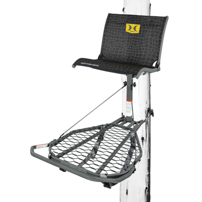 The Hawk Helium Kickback LVL Hang-On stand redefines comfort and convenience in hunting. Crafted from lightweight black aluminum, it is over 35% lighter than the original model, making it easy to transport and set up. This stand features an Ultimate Kickback Footrest and a Mesh Comfort Textile seat with a contoured backrest, ensuring that long hours in the field are spent in comfort. The oversized mesh platform is engineered for noise-free use, thanks to self-lubricating DuPont Teflon bushings and washers, and welded at every point. Tree Digger Teeth and silent over-molded attachment hooks provide a secure and quiet setup, so you can focus on your hunt without distraction. With a seat measuring 21 inches wide, 15 inches deep, and 15 inches high, the Hawk Helium Kickback LVL Hang-On stand is the perfect companion for your next outdoor adventure.