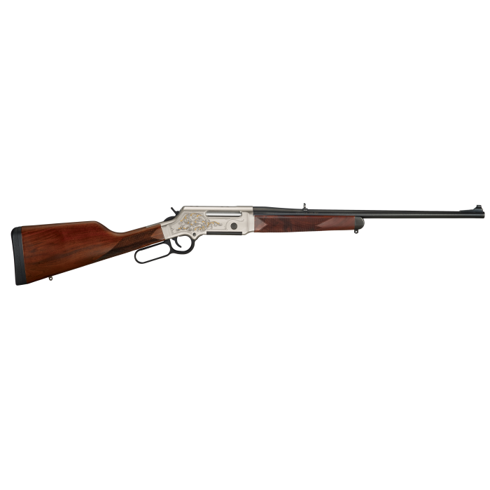 The Henry Long Ranger in .223 Rem is a finely crafted lever-action rifle that combines classic design with modern functionality. Featuring a 20-inch steel barrel with a 1:9 twist, this rifle ensures precision and reliability in every shot. Weighing in at 7 pounds, it offers a balanced feel, perfect for both hunting and target shooting. The fixed walnut stock with a brown and tan finish provides a traditional look and is equipped with a black solid rubber recoil pad for added comfort. Its nickel-plated receiver is adorned with detailed scroll engraving and highlighted with 24K gold inlay, making it not just a firearm, but a work of art. With a 5+1 capacity, it includes ivory bead front and adjustable folding rear sights, ensuring you are ready for any situation. The rifle is also drilled and tapped for scope mounts, allowing for further customization. Built for the right-handed shooter, the Henry Long Ranger is a testament to quality craftsmanship and timeless style.