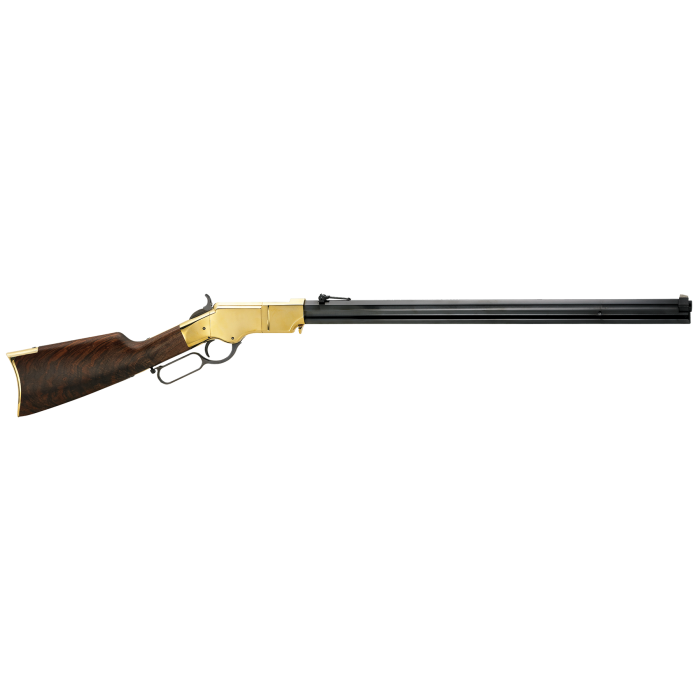 Invented in the 1850's by Benjamin Tyler Henry, this lever action rifle's rapid fire capability and high-capacity tubular magazine stood in amazing contrast to its single-shot musket counterpart. The Original Henry Rifle is identical to its history-making forerunner with the exception of caliber. Henry replaced the obsolete .44 Rimfire cartridge, exchanging it for the .44-40 caliber. Every other facet remains true to its inventor, and each gun's serial number begins with the initials BTH in his honor. The Original Henry Rifle has a grooved receiver for easy scope mounting. The hardened brass has the same tensile and yield strength as steel. The Original Henry Rifle also features a one piece, 24.5" inch octagonal barrel/tubular feed; a genuine American fancy walnut buttstock with a hardened brass buttplate, and a classic folding ladder rear sight paired with a traditional blade front sight. All Henry Repeating Arms products and parts are manufactured in the U.S.A.