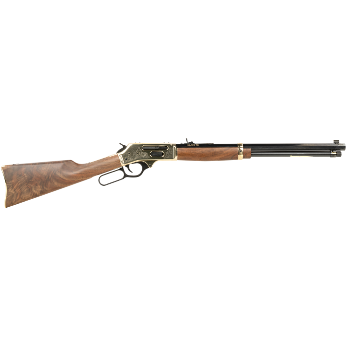 The Henry Wildlife 30-30 Win Lever Rifle combines classic design with modern craftsmanship. Featuring a 20-inch octagon barrel and a smooth lever action, this rifle offers both accuracy and reliability. Its high-polished brass receiver is adorned with intricate engravings, showcasing an American vine scroll and a stately buck's head, adding a touch of elegance to its rugged functionality. The American walnut stock not only provides a traditional look but also ensures durability and a comfortable grip. With a 5+1 capacity, brass bead front sight, and adjustable semi-buckhorn rear sight, this rifle is designed for precision shooting. Ideal for right-handed shooters, it includes a transfer bar safety mechanism for added security. Weighing in at 8.30 lbs and measuring an overall length of 39 inches, it strikes a perfect balance between weight and maneuverability, making it an excellent choice for hunting enthusiasts.