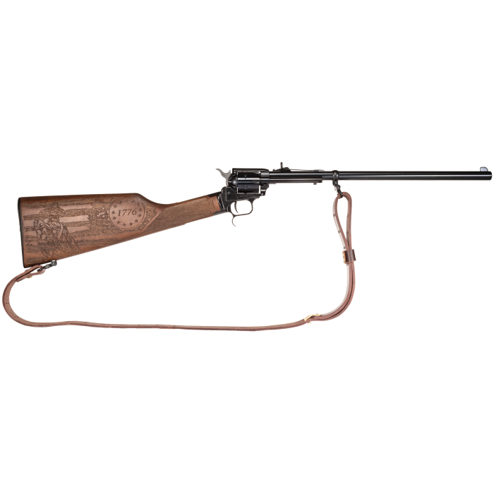 Equipped with adjustable buckhorn sights, the Rough Rider Rancher Carbine ensures quick and clear sighting on any target. The laser-engraved skeleton soldier design on the wood stock commemorates 1776 Independence Day, adding a touch of historical elegance. The fixed engraved stock not only enhances the aesthetic appeal but also provides a stable and comfortable shooting experience.