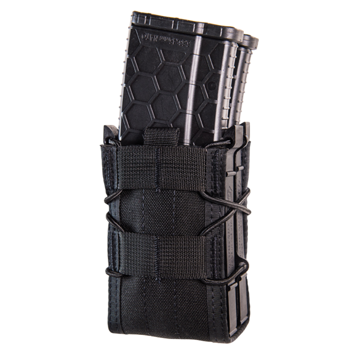 The High Speed Gear TACO X2R Mag Pouch in black nylon offers a versatile and secure solution for carrying multiple rifle magazines. Designed with MOLLE compatibility, this pouch utilizes injection-molded polymer brackets and Cordura for enhanced durability. The unique shock cord lacing and HDPE separation ensure that USGI, HK, PMAG, ARC, FAL, AK 30/40, LR20, and M14 magazines are securely held while allowing for easy and silent deployment. With two compartments, this pouch is ideal for efficiently organizing and accessing your gear in any tactical situation.