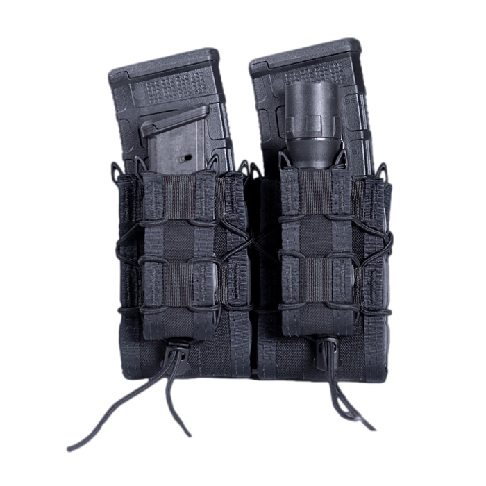 The High Speed Gear Double Decker TACO is a versatile and secure pouch designed to accommodate a wide range of magazines and accessories. Combining the TACO and Pistol TACO into one streamlined unit, it is constructed from durable nylon with injection-molded polymer brackets and shock cord for added strength. This black pouch is compatible with MOLLE mounting systems, offering reliable performance in various tactical situations.