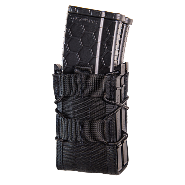 The High Speed Gear Polymer Taco Black Molle Magazine Pouch is a versatile and durable solution for securely carrying a wide variety of magazine styles and calibers. Crafted from a proprietary polymer, the pouch features a flexible yet sturdy body and brackets, laced together with a reliable bungee cord for adjustable retention. Its innovative pop lock design keeps excess bungee neatly oriented down and out of the way, while integrated grommets provide efficient drainage. Designed for ultimate compatibility, it mounts seamlessly to molle systems and belts up to 2 inches wide using High Speed Gear’s universal HSGI clips. The sleek black finish and rugged polymer construction make this pouch a dependable choice for any tactical setup.