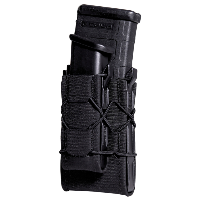 The High Speed Gear Gen 2 Double Decker Taco in black is a cutting-edge magazine pouch designed for maximum functionality and durability. This updated version is sleeker, lighter, and more versatile than the original, offering a 20% weight reduction while maintaining exceptional performance. It securely holds one rifle magazine and one pistol magazine or similarly sized items, thanks to its contoured molded sides that ensure easy insertion and an integrated shock cord for adjustable retention. Constructed with laser-cut nylon laminate wrapped over a woven thermoplastic core, it combines strength and lightweight efficiency. The 1/2-inch interval MOLLE on the back provides flexible mounting options for both MOLLE and belt setups, making it a must-have for tactical gear enthusiasts.