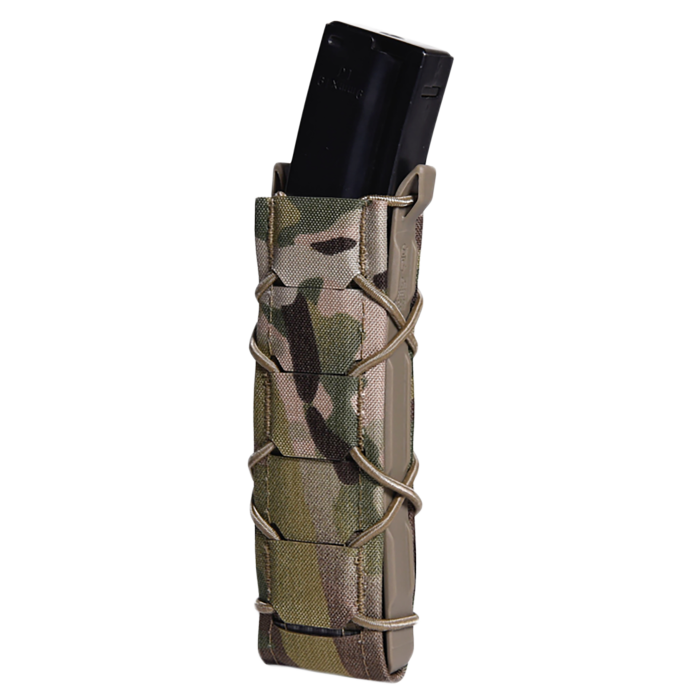 The High Speed Gear Gen 2 Extended Multi-Cam TACO is a lightweight, versatile solution for carrying your gear. Designed to hold one long pistol or SMG magazine, as well as similarly sized items like batons or flashlights, this pouch offers unmatched adaptability. Its contoured molded sides ensure smooth and effortless magazine insertion, while the integrated shock cord allows for adjustable retention to keep your items secure. Constructed with durable laser-cut nylon laminate over a woven thermoplastic core, this generation 2 TACO is nearly 20% lighter than its predecessor without compromising strength. The 1/2-inch interval MOLLE on the back provides flexible mounting options for both MOLLE and belt configurations. Finished in a sleek Multi-Cam design, this TACO is built for performance and reliability.