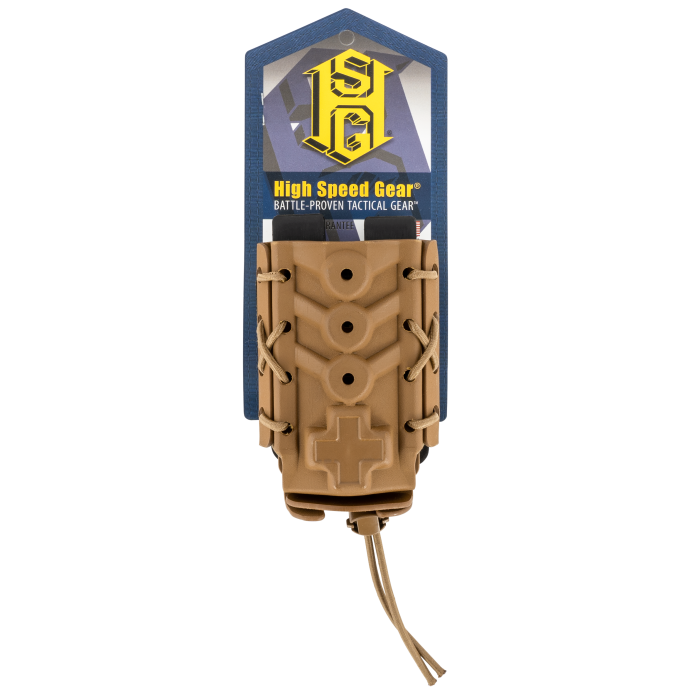 The High Speed Taco Tourniquet Coyote is your ultimate tourniquet holder designed to adapt and perform. Compatible with multiple tourniquet models like SAM XT, C-A-T, and SOF TT Wide, this versatile pouch offers superior retention and accessibility. Made from heavy-duty nylon, it features an adjustable shock cord, streamlined interior, and removable flap for custom functionality. The loop fastener panel on the front allows you to attach label patches, and it conveniently includes a TQ patch. Its durable Kydex build in a smooth coyote brown finish ensures lightweight resilience, while the MOLLE-compatible belt clip fits belts up to 2". Reliable, rugged, and ready for action—built for versatility and speed in demanding conditions.
