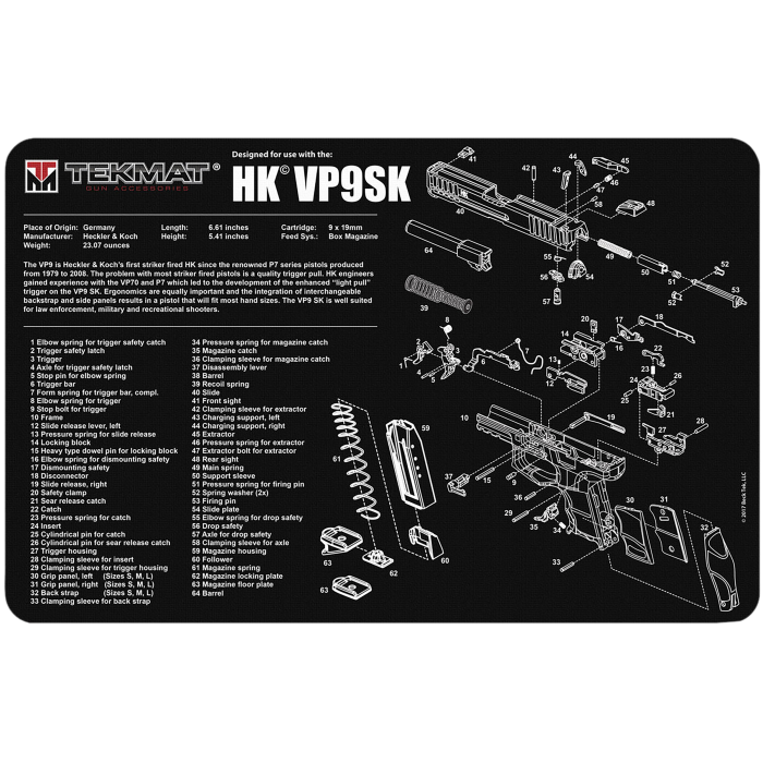 The TekMat Cleaning Mat offers an ideal workspace for handgun maintenance, featuring a generous 11 x 17-inch surface to accommodate a fully disassembled firearm along with necessary tools and accessories. Crafted from durable rubber, this mat provides an 1/8-inch padding that cushions against rough handling and accidental drops. Its ultra-soft, oil and water-resistant surface prevents scratches and chipping, ensuring your firearm remains in pristine condition. Detailed diagrams and illustrations on the mat guide you through cleaning and disassembly, making it an essential addition to any gun enthusiast's toolkit.