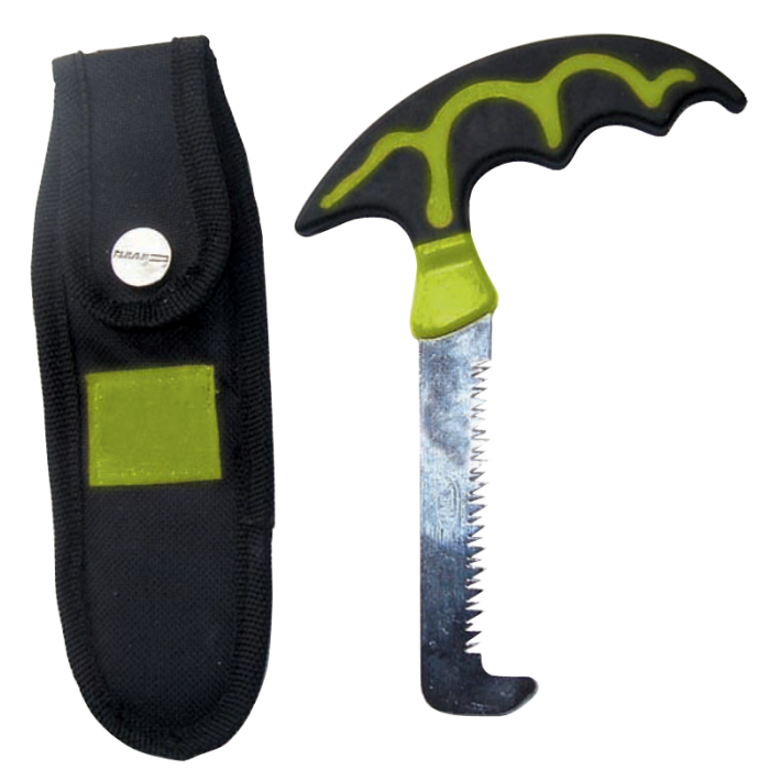 The HME Bone Saw with Scabbard features a super-sharp stainless steel blade designed to easily cut through the pelvic bone of deer and large game. Its easy-grip black textured Trimond handle ensures reliable use, while a raised blade end acts as a stop for added control. Complete with a scabbard with belt loop for safe storage and transport, this fixed saw blade is perfect for hunters tackling tough cutting tasks.