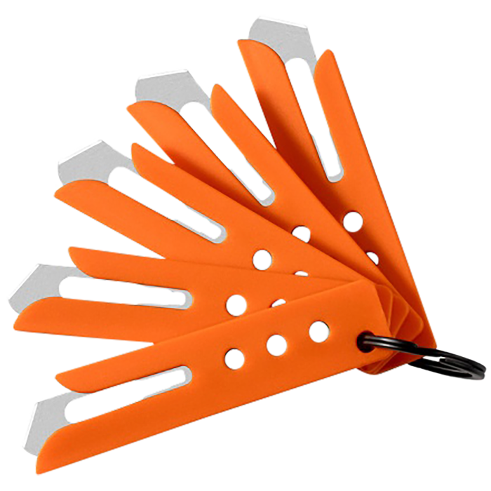 Hogue® - 35884 - Expel™ A compact and lightweight safety cutting tool designed for quick and controlled slicing tasks. The Expel™ Blade Guard includes five #60 high carbon steel blades for reliable cutting performance. Its bright orange nylon body enhances visibility and everyday carry convenience.