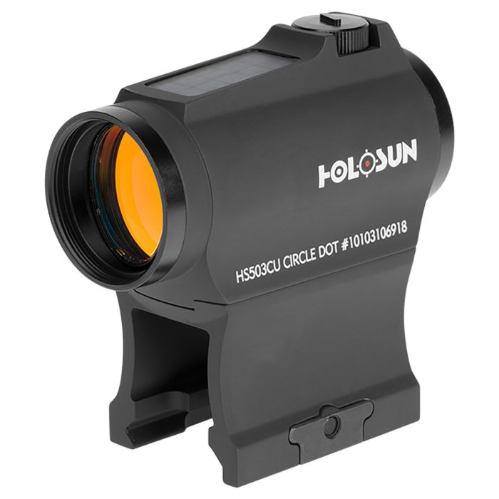 The hs503cu is an open reflex optical sight designed rifle and carbine applications.Features include aluminum housing, holosun's super led with up to 50k hours battery life; 12 brightness setting- 10 daylight & 2 night vision; 2 moa dot/65 moa circle; parallax free and unlimited eye relief; solar failsafe and shake awake.Includes lower 1/3 cowitness mount, low profile mount, rubber cover, lens cloth, cr1632 battery, t10 l key and user manual.