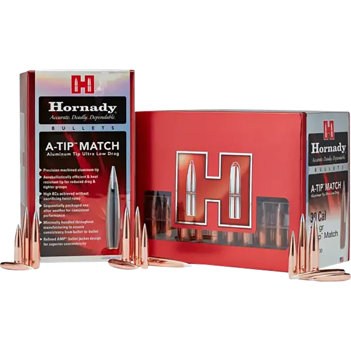 The Hornady A-Tip .338 300 Gr A-Tip Match bullets are expertly designed for precision shooting. Each bullet features a copper jacket and a lead core, ensuring optimal performance. With a bullet diameter of .338 and a sectional density of .375, these bullets are engineered for superior accuracy. The aluminum bullet tip enhances aerodynamic efficiency, contributing to a high ballistic coefficient of .863. Packaged with 100 bullets per box, these A-Tip Match bullets are an excellent choice for competitive shooters seeking consistency and precision.