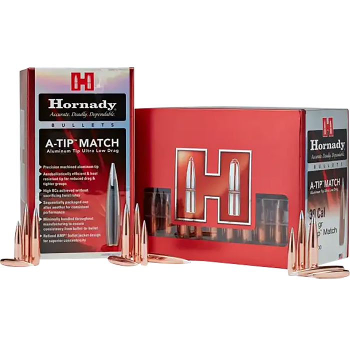 The Hornady A-Tip .375 390 Gr A-Tip Match bullets are expertly engineered for precision shooting. Each bullet features a copper jacket and a lead core, enhancing durability and performance. The aluminum bullet tip is designed for optimal aerodynamics, contributing to the impressive ballistic coefficient of .987. With a bullet diameter of .375 and a sectional density of .396, these bullets offer exceptional stability and accuracy. Available in boxes of 25, they are ideal for competitive shooters seeking high-quality ammunition.