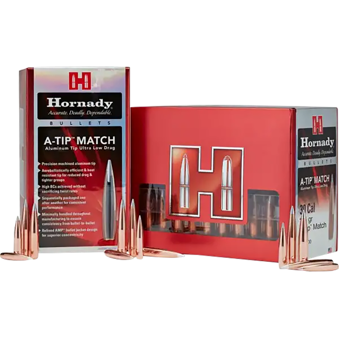 The Hornady A-Tip .416 500 Gr A-Tip Match bullets feature a copper jacket and a lead core, ensuring superior performance and reliability. Designed for precision, these bullets come with an aluminum tip, enhancing aerodynamic efficiency. With a bullet diameter of .416 and a weight of 500 grains, they are perfect for competitive shooting or long-range precision. Each box contains 25 bullets, offering a sectional density of .396 and an impressive ballistic coefficient of .976, making them an excellent choice for marksmen seeking accuracy and consistency.