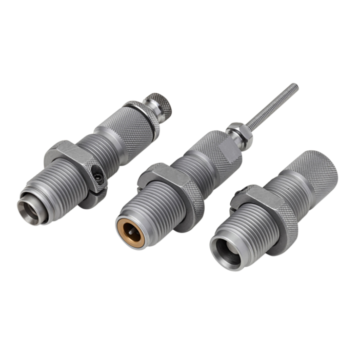 Hornady Custom Grade Rifle Dies sport a slippage-eliminating Zip-Spindle? design for a perfectly aligned fit and easy spindle-lock tightening. A sliding alignment sleeve holds the bullet case neck and seating stem before loading for straight bullet seating. Polished elliptical expander smoothly releases from case necks and eliminates the need for a separate expander die. Wear-reducing all-steel seater adjustment screw with a compression washer for fine adjustments. Retainer ring for easy cleaning. Sure-Loc? rings make fine-tuning easy. Sturdy steel decapper. Built-in crimper gives you the ability to crimp without a separate crimping die. Hornady steel dies are hand-inspected and heat-treated for durability and strength.