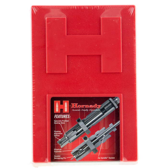 Hornady Custom Grade Rifle Dies sport a slippage-eliminating Zip-Spindle? design for a perfectly aligned fit and easy spindle-lock tightening. A sliding alignment sleeve holds the bullet case neck and seating stem before loading for straight bullet seating. Polished elliptical expander smoothly releases from case necks and eliminates the need for a separate expander die. Wear-reducing all-steel seater adjustment screw with a compression washer for fine adjustments. Retainer ring for easy cleaning. Sure-Loc? rings make fine-tuning easy. Sturdy steel decapper. Built-in crimper gives you the ability to crimp without a separate crimping die. Hornady steel dies are hand-inspected and heat-treated for durability and strength.