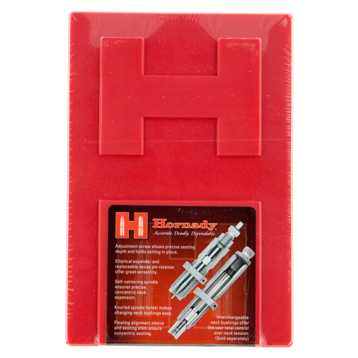 The Hornady Match Grade 2-Die Set for 6.5 PRC is designed for precision and control in your reloading process, enhancing your shooting accuracy. This full-length die set allows for meticulous adjustments with its self-centering neck-size bushings, ensuring your case necks are neither overworked nor oversized. The set includes a bushing style die and an inline bullet seating die equipped with a micro-just seating micrometer for precise seating depth adjustments. It also features an elliptical expander, decap pin retainer, standard bullet seating stem, and a Custom ELD Match bullet seating stem, all crafted to deliver superior performance and tighter shot groups.