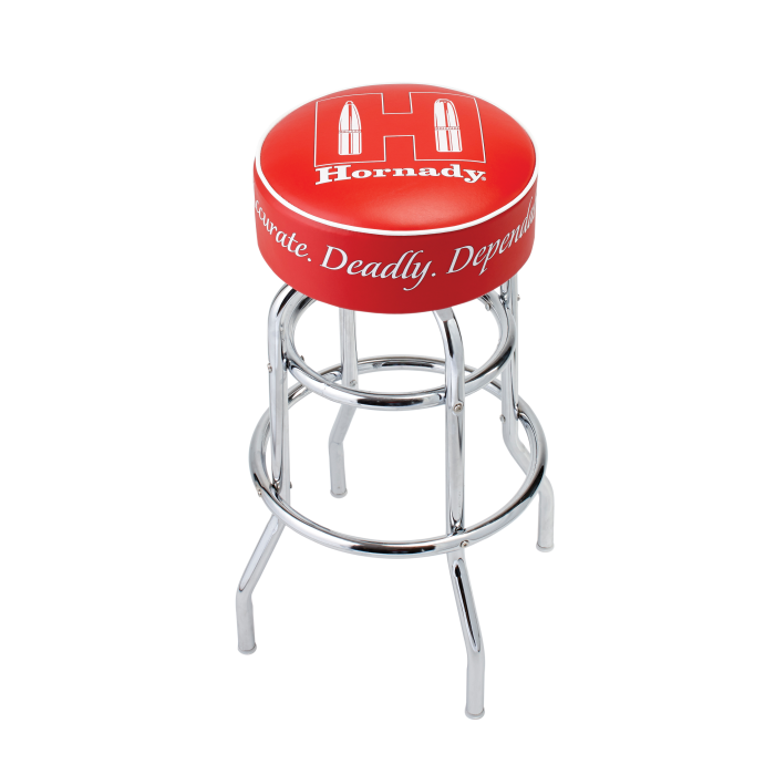 Enhance your reloading room, garage, or bar with this sleek and comfortable stool. The Hornady Reloading Bench Stool combines function and style, featuring a striking red seat with the iconic Hornady logo. Built with durable marine-grade vinyl and thick foam padding, it ensures comfort during extended use. The chrome double-rung reinforced legs provide stability and a touch of elegance, making it a practical yet fashionable addition to any space. With dimensions of 20" x 20" x 31", this stool is the perfect blend of form and function.