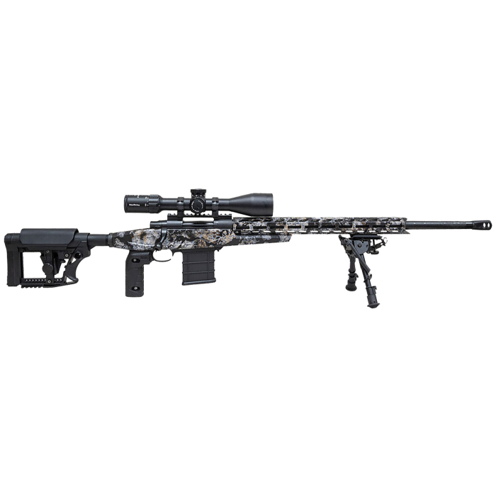 This bolt-action rifle, chambered in 6.5 Creedmoor, features a 24" barrel length and a two-stage trigger for a crisp and predictable pull. The three-position safety provides added security, and the overall length ranges from 43" to 47.25", accommodating various shooting styles and preferences. The receiver is constructed from durable aluminum, and the stock finish group is black, complemented by a digital camouflage metal finish group. Designed for right-handed shooters, the Howa chassis rifle is a top choice for those seeking a high-performance, customizable firearm for long-range shooting.