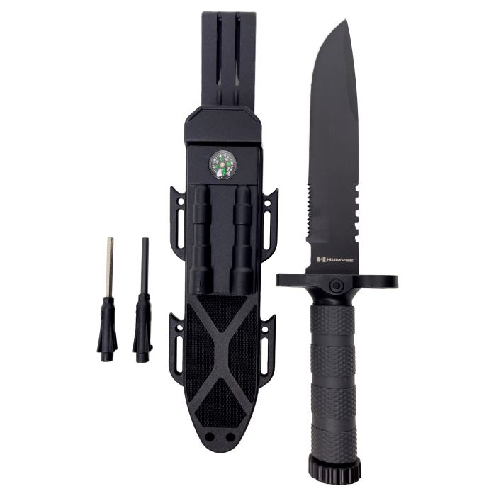 The Humvee Next Gen Survival Knife features a durable 12.5" design with a 7.5" stainless steel sawback blade and a black textured rubber grip for secure handling. Its nylon sheath includes essential survival tools like a compass, fire starter, and whistle. Built for versatility, it combines hammer strength, a plain edge, and rugged reliability for outdoor and survival needs.