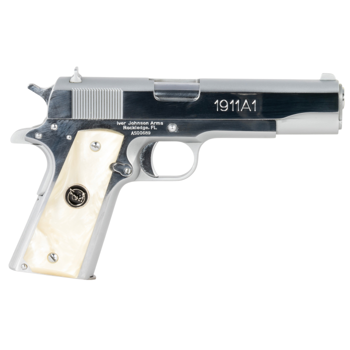 Experience classic elegance and modern performance with the Iver Johnson 1911A1 .38 Super. This firearm boasts a 5-inch stainless steel barrel and a striking bright polish chrome finish that sets it apart. The serrated slide ensures a solid grip, enhancing handling and precision. Complemented by exquisite pearl grips, this pistol combines style with functionality. With an 8+1 capacity, it's designed for reliability and efficiency. Whether for collection or use, this 1911A1 is a perfect blend of tradition and innovation, offering a unique shooting experience.