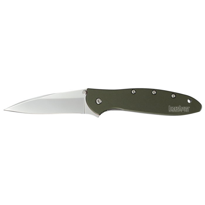 The Kershaw Leek Olive Drab Folding Knife features a 3" Sandvik 14C28N stainless steel drop-point blade, offering razor-sharp durability. Its anodized-aluminum handle in olive drab is fade- and scratch-resistant, ensuring lasting quality. Weighing just 2.4 oz with a sleek 4" closed length, its flipper design, pocket clip sheath, and precise edge make it a versatile everyday tool.