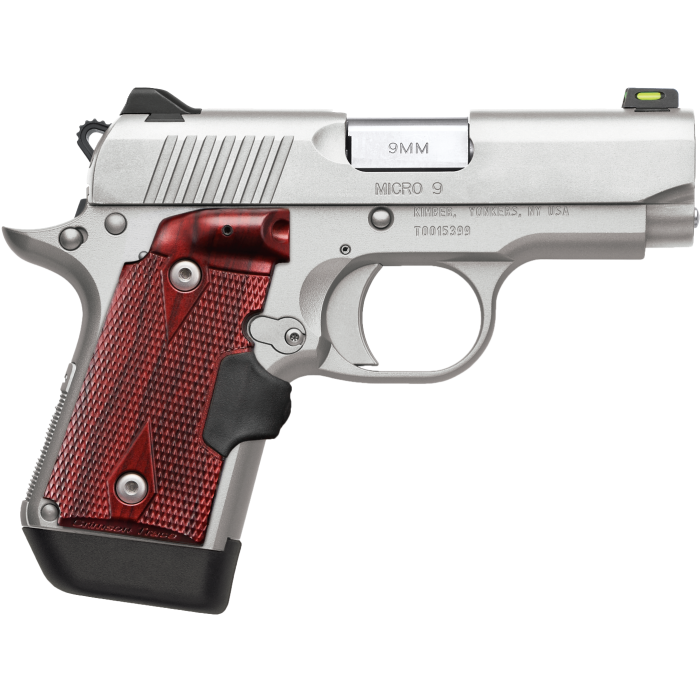 The Kimber Micro 9 stands out as a compact and easily concealable firearm designed for optimal performance and user comfort. With its 1911-inspired controls, intuitive operation, and smooth trigger pull, it ensures reliable handling for both seasoned shooters and newcomers. This stylish pistol features Crimson Trace Lasergrips in elegant rosewood, offering enhanced precision with an integrated laser targeting system. Its green fiber optic front sight provides quick target acquisition, while the mild recoil and 9mm chambering add confidence for everyday carry. The Kimber Micro 9's 3.15-inch barrel and 7+1 capacity merge compact size with practicality, making it a compelling choice among compact firearms.