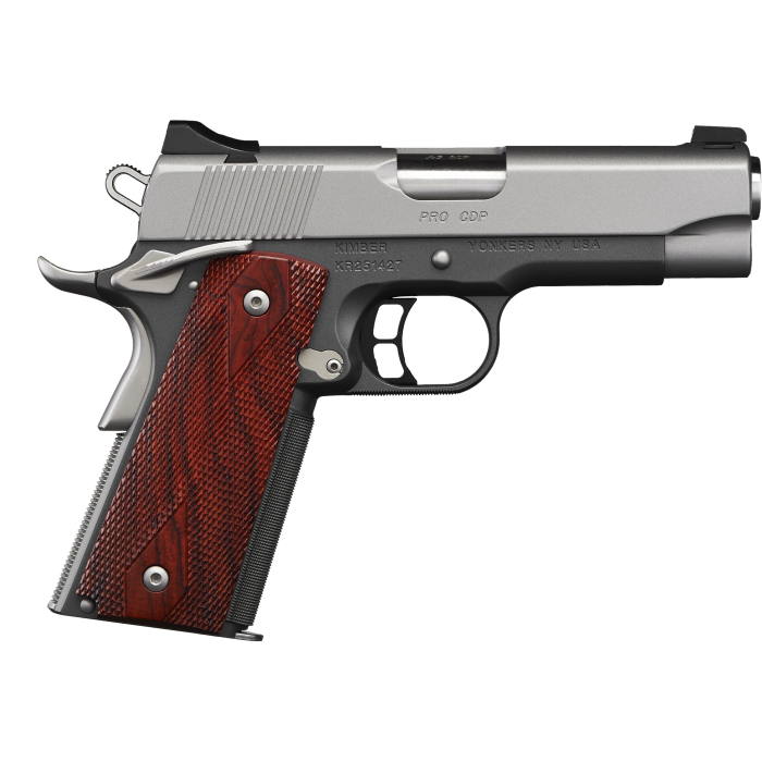 The Kimber CDP (Custom Defense Package) pistol offers a precision-engineered firearm with superior features that set it apart. Featuring a durable Charcoal Gray KimPro II frame finish, this 9mm caliber pistol combines elegance with rugged functionality. The compact 4-inch barrel ensures excellent balance between accuracy and maneuverability, making it ideal for personal defense. With a 9+1 capacity and an ambidextrous thumb safety, it accommodates both left- and right-handed shooters seamlessly. Enhancing its aesthetics and comfort, the Rosewood grips exude sophistication while providing a secure hold. The Slide Top design further complements its refined performance, making the Kimber CDP a premium option for those seeking reliability and style in a defensive pistol.