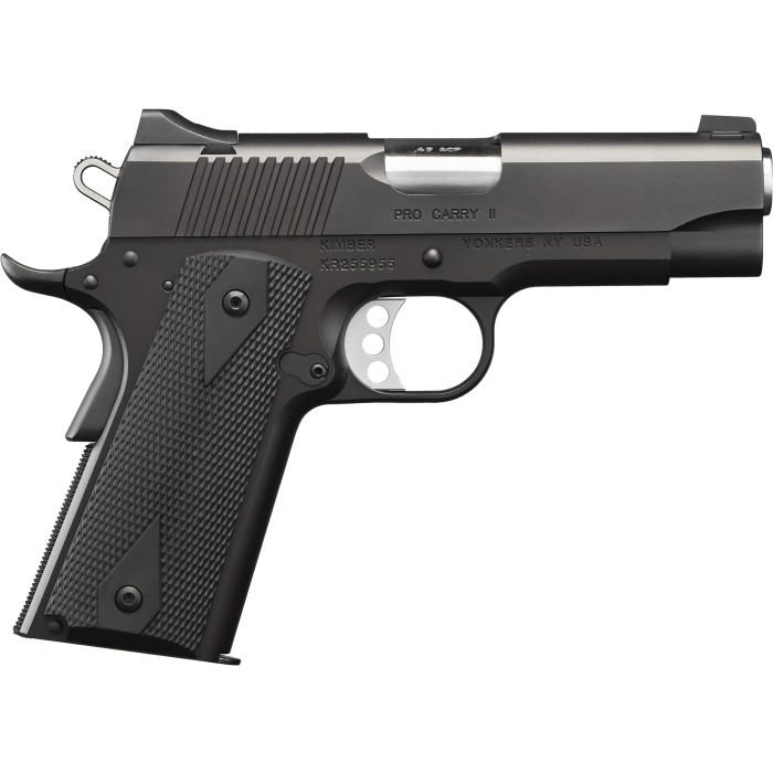The Kimber Pro Carry II stands out as a versatile and reliable firearm, tailor-made for concealed carry, personal defense, and general use. Featuring a 4-inch match-grade carbon steel barrel, it offers exceptional accuracy and performance in a compact design. The sleek matte black finish on the frame adds durability and a classic look, while the ergonomic black synthetic grips with double diamond checkering ensure a secure and comfortable hold. Chambered in .45 ACP with a 7+1 capacity, the Pro Carry II pairs firepower with a streamlined, full-length grip that enhances control without compromising concealability. Designed to meet the standards of discriminating shooters, this Kimber model effortlessly combines precision, functionality, and aesthetics.